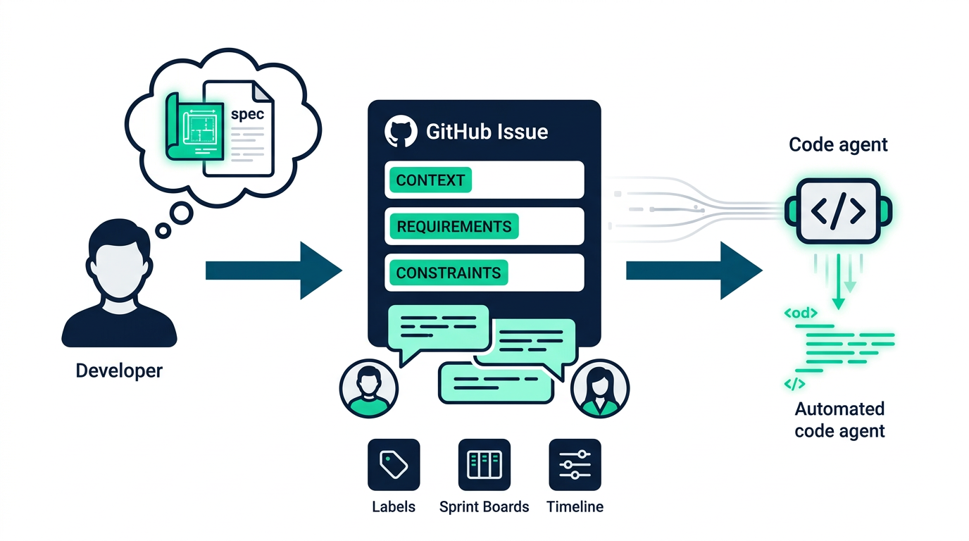 Løsningen er å bruke ditt team sitt prosjektstyringsverktøy som persistent hjem for specs. Jeg bruker GitHub Issues med GitHub CLI, men det samme prinsippet gjelder med Jira CLI, Linear, Notion MCP, eller hva teamet ditt allerede bruker.