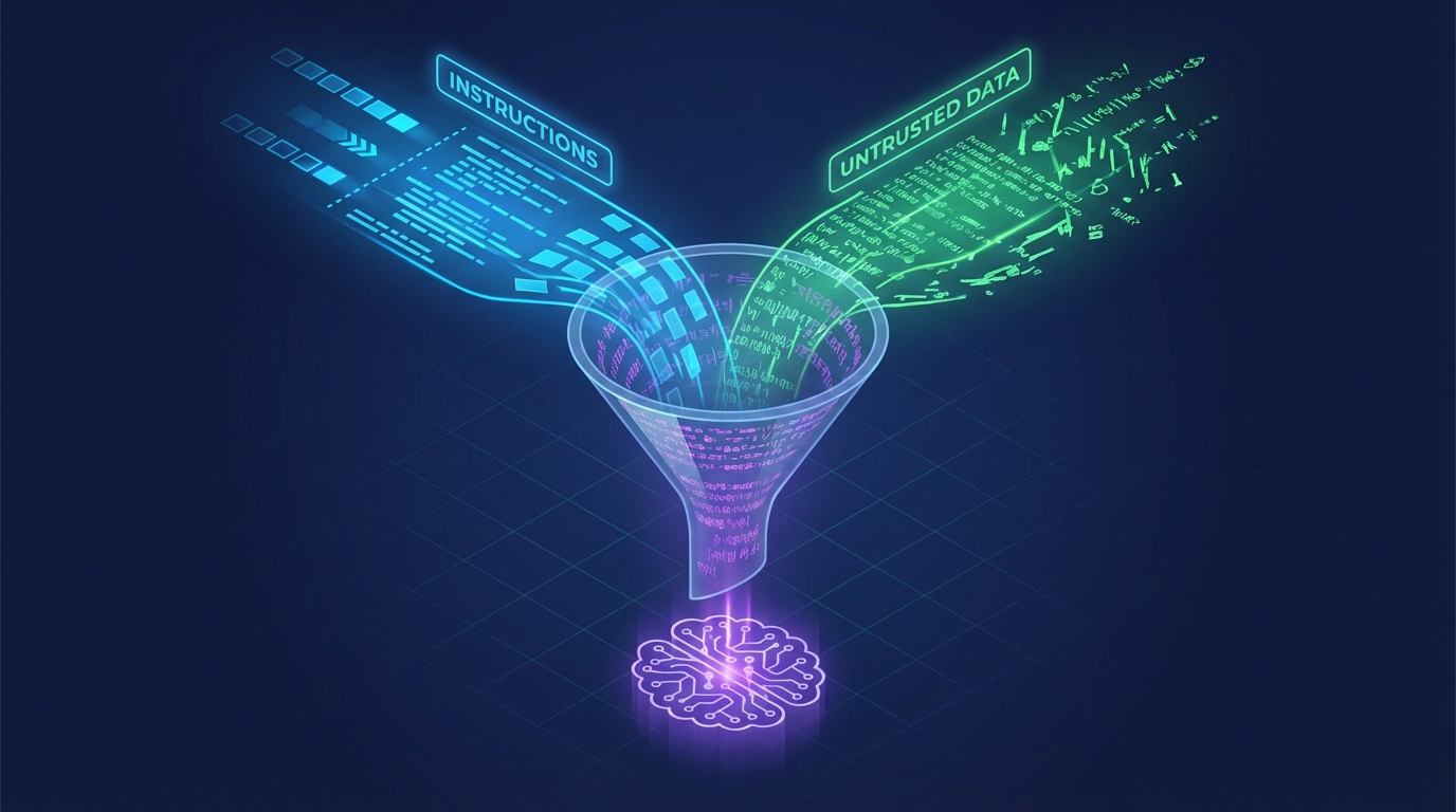 Systemprompt, brukerinstruksjoner og eksternt innhold blandes sammen til én lang sekvens av tokens. Modellen har ingen innebygd mekanisme for å si: «Denne teksten er en instruksjon fra sjefen, mens denne teksten bare er data jeg fant på nettet.» Alt er bare kontekst for å forutsi neste ord.