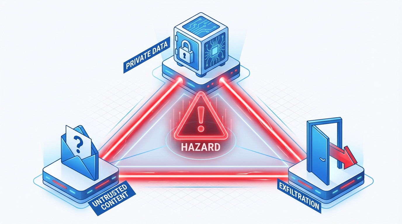 Simon Willison bruker en modell han kaller The Lethal Trifecta . Når tre egenskaper møtes, oppstår høy risiko:
