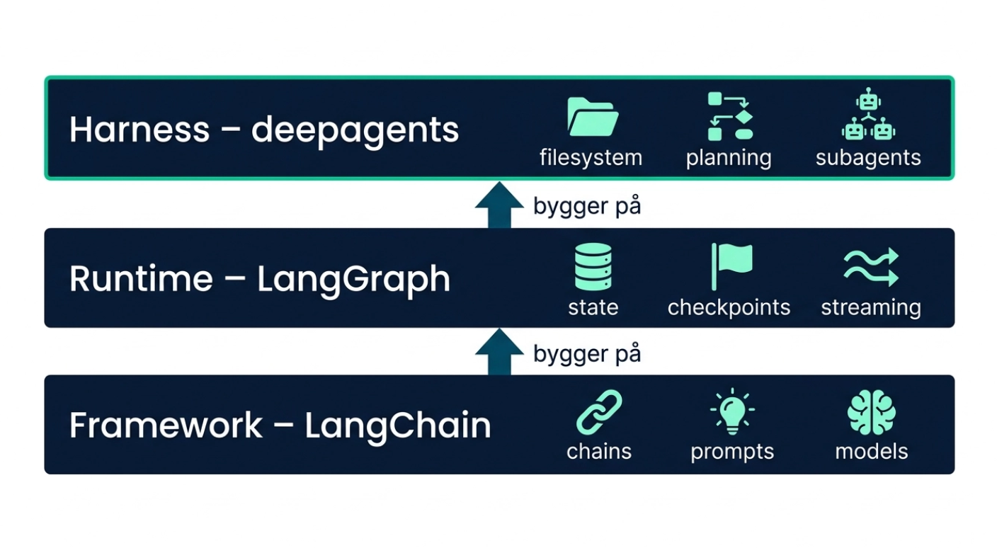 LangChain-økosystemet består av tre distinkte lag. Nederst har du LangChain som framework: abstraksjoner og en mental modell for å bygge med LLM-er. Over det ligger LangGraph som runtime: varig utførelse, streaming, persistens og human-in-the-loop. Øverst sitter deepagents som harness: alt fra de to lagene under, pluss forhåndskonfigurerte prompts, filsystem, planlegging og subagenter.
