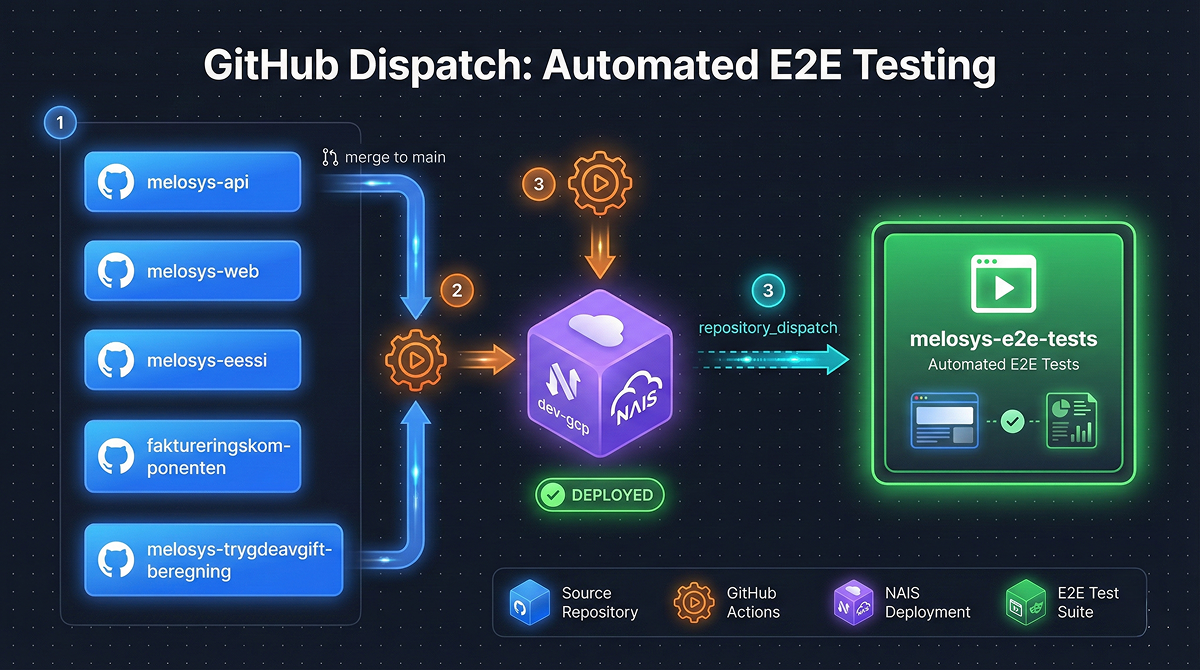 En av de viktigste delene av infrastrukturen er dispatch-systemet som automatisk kjører E2E-tester når noen pusher kode.