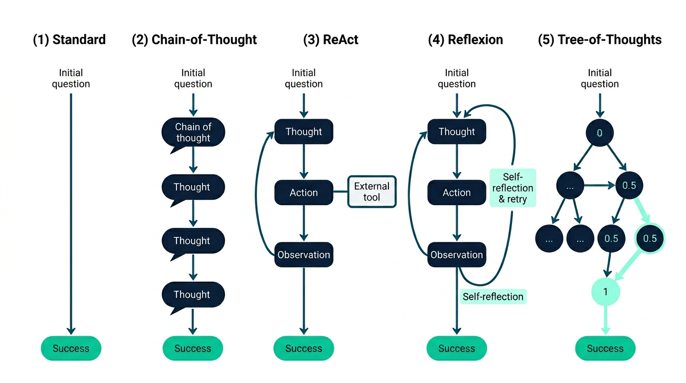 Hvorfor fungerer dette bedre enn ren resonnering? Forskjellen ligger i tilbakemeldingssløyfen. Chain-of-Thought (CoT), en annen teknikk, lar modellen tenke steg-for-steg, men den kan bare resonnere basert på det den allerede "vet". Uten tilgang til verktøy risikerer den å hallusinere fakta. ReAct løser dette (så fremt den har tilgang på gode verktøy) ved å la modellen sjekke antakelsene sine mot virkeligheten gjennom handlinger.